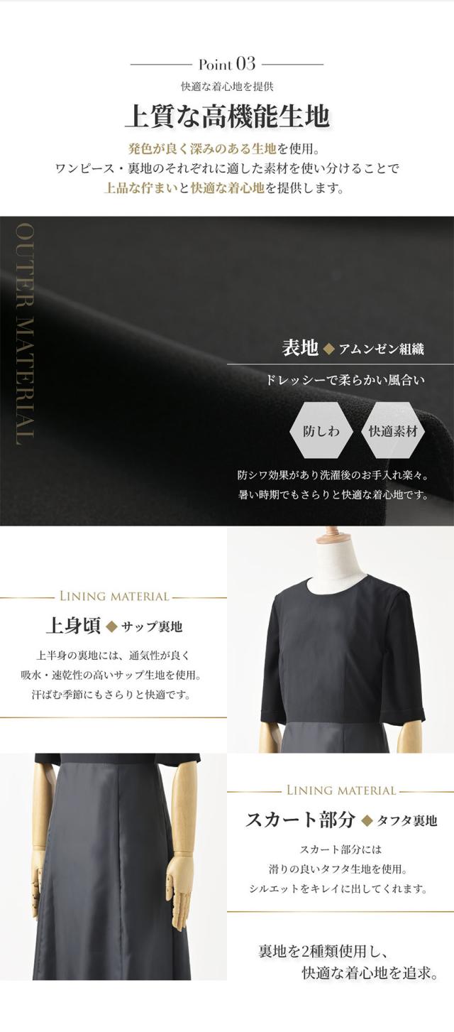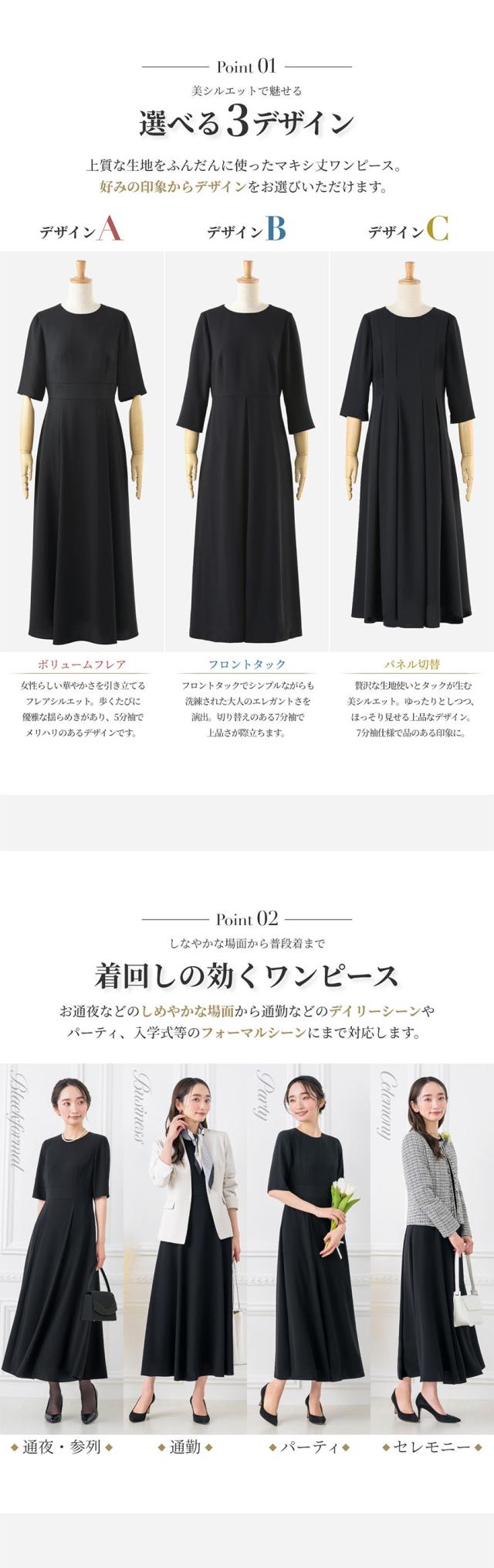 | 上質な生地を贅沢に使用したロングワンピース。 程よい落ち感のある素材が美しいシルエットを生み出し、上品で洗練された印象を演出します。 デザインAはたっぷりとした裾フレアが特徴で、歩くたびに優雅に揺れ、女性らしい華やかさを引き立てます。 デザインBはフロントタックを施し、控えめながらも洗練されたアクセントを加え、シンプルながらも品格を感じさせる仕上がりです。 デザインCはゆったりとしながらも、ほどよく引き締まったシルエットで上品な印象を与えます。 上身頃はシンプルで洗練されたデザインになっており、全体のバランスを美しくまとめ、さらりと1枚で着るだけで大人のこなれた品格を感じさせます。 気になる二の腕や下半身を自然にカバーし、着痩せ効果も期待できるシルエットです。 お通夜や法要などの厳かな場面はもちろん、通勤やデイリーシーン、パーティー、入学式などのフォーマルなシーンにも対応。ジャケットやアウターと組み合わせることで、季節を問わず着用できるのも魅力のひとつです。 快適な着心地にもこだわり、上身頃にはべたつきや肌への張り付きを抑えたさらりとした風合いのサップ裏地を使用。 スカート部分には滑らかなタフタ裏地を採用し、美しいシルエットと動きやすさを両立させました。 異なる2種類の裏地を使用することで、快適さと美しさを兼ね備えた一着に仕上げています。 上品さと実用性を兼ね備え、洗練された大人の女性にふさわしいロングワンピースです。 | |