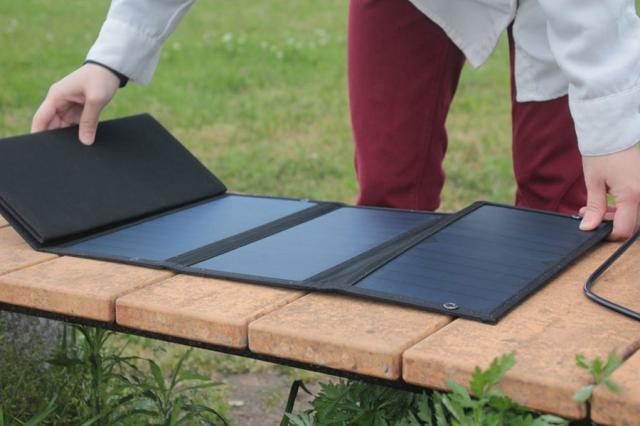晴天時にはアウトドアでも充電できる、40Wのソーラーパネルです。