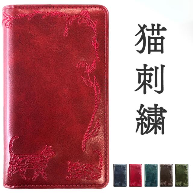 猫 刺繍 手帳型ケース(内側:黒TPU ケース)