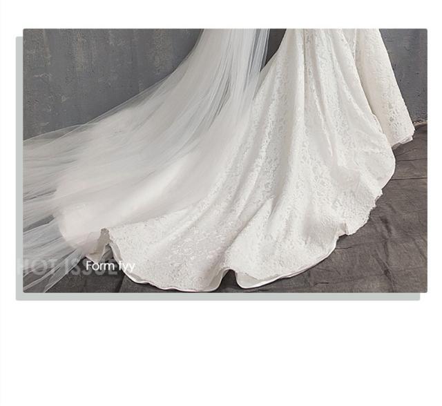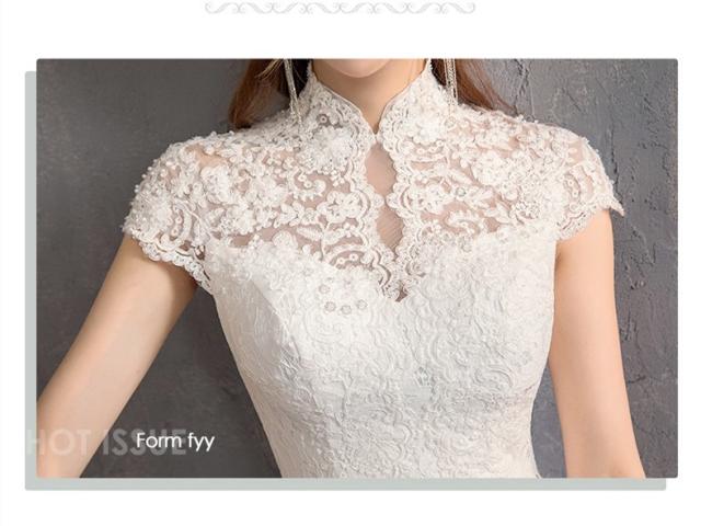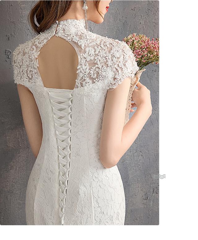 復古調 レース マーメイド ウェディングドレス トレーン スレンダー 立ち襟 白 小さい〜大きいサイズ ベール グローブ付 結婚式 H084