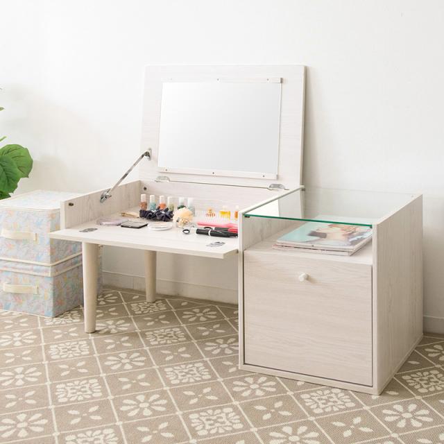 開閉式ミラーでドレッサーにも、ローデスクにも、センターテーブルにもなる一台三役の便利なローデスクドレッサー。