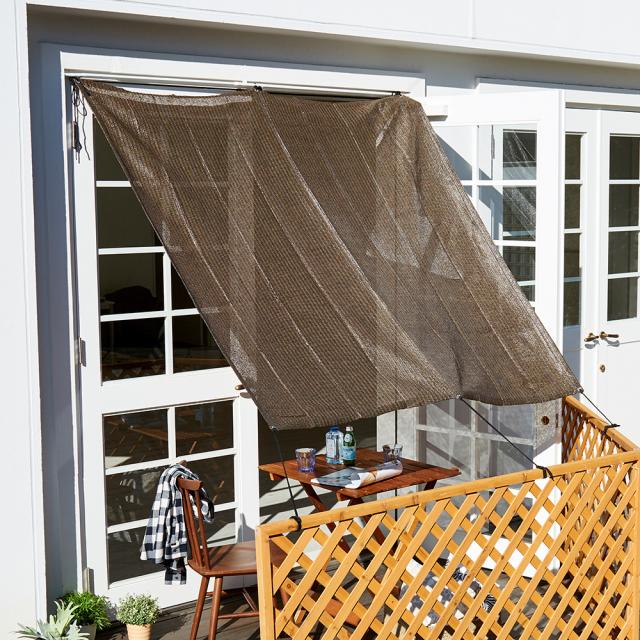日差しを遮り、風を通す!通風性のある生地で、風を通しながら強い日差しや気になる視線をカット。日よけ・遮熱できるサンシェードで涼しく快適に。西日対策としても使えます。紐で固定するので設置場所も取り付け方もいろいろ!バルコニーやリビング窓、テラスなどに。