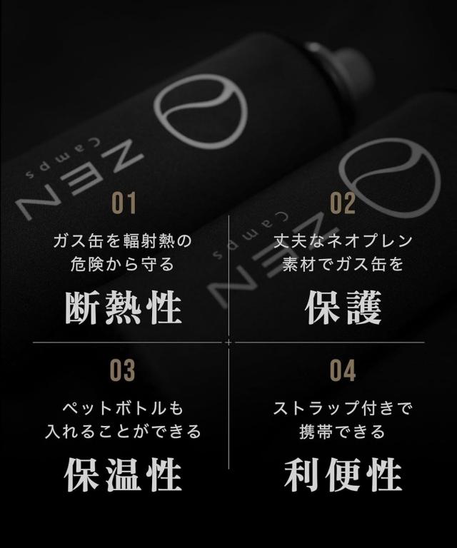 断熱性に優れたネオプレン素材を使用し、輻射熱からガス缶を守ります。