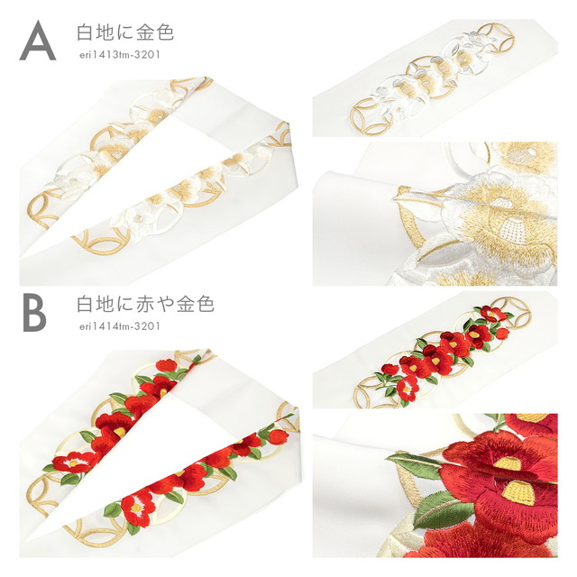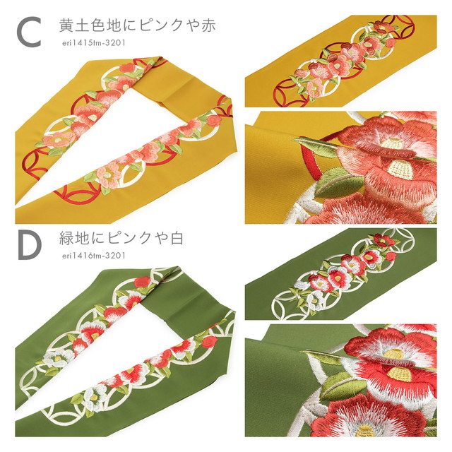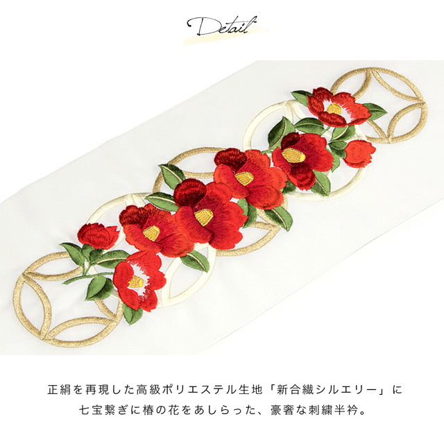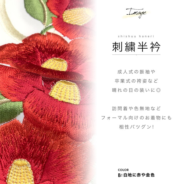 半襟 刺繍 振袖 半衿 成人式 白 黄土色 緑 赤 黒 金色 椿 花 七宝繋ぎ 新合繊 シルエリー 留袖 婚礼 白無垢 はんえり 和装小物 女性 レディース 日本製 送料無料 メール便
