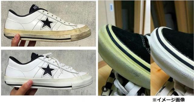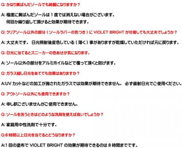 | VIOLETBRIGHTはスニーカーアウトソールクリーナーです。今まで、不可能といわれたアウトソールの黄ばみを日光を利用し強力に取り除きます。クリア、クリアブルー、グロウ、ホワイトソールに威力を発揮します。1本で約10足分ご使用できます。 VIOLETBRIGHTのより効率的な使い方ソールは良く洗う、挟まっている石なども取り除きましょう。VIOLETBRIGHTはたっぷりと塗りましょう。 【重要】 ※必ず直射日光でご利用ください。 【使用方法】 ●使い方かたは簡単4STEP 1.ご使用になりたいスニーカーアウトソールを洗剤で良く水洗い、水分を拭き取ります。 2.VIOLETBRIGHTを黄ばみの気になるところへ塗り、ソール全体をラップで覆います。 3.日光を約4〜8時間照射。 4.ラップを剥がしてよく水洗いしてください。 ●黄ばみが気になるようであれば1〜4を繰り返してください。 |
