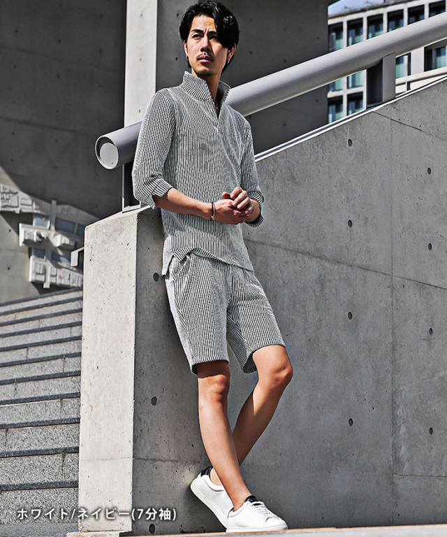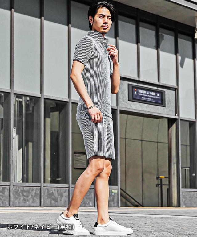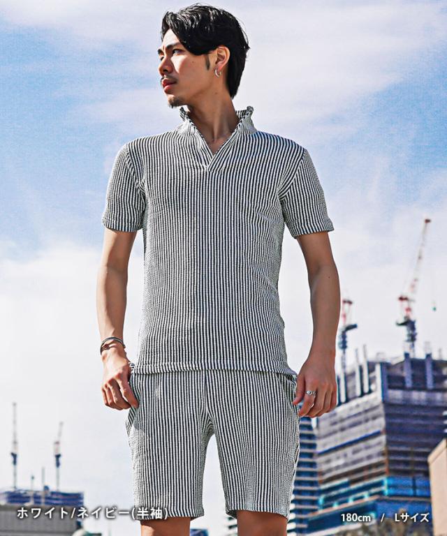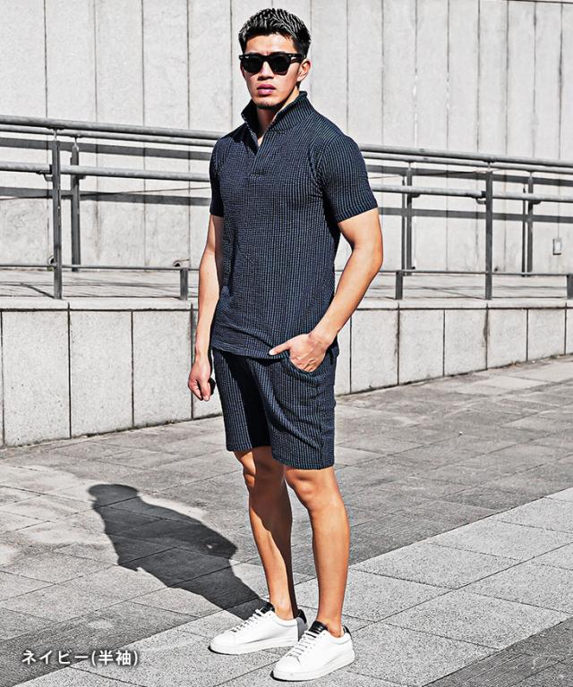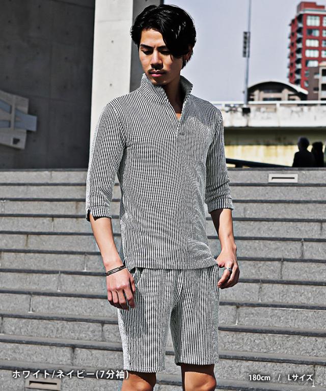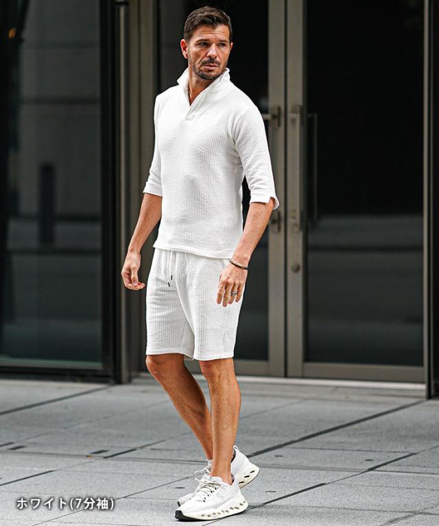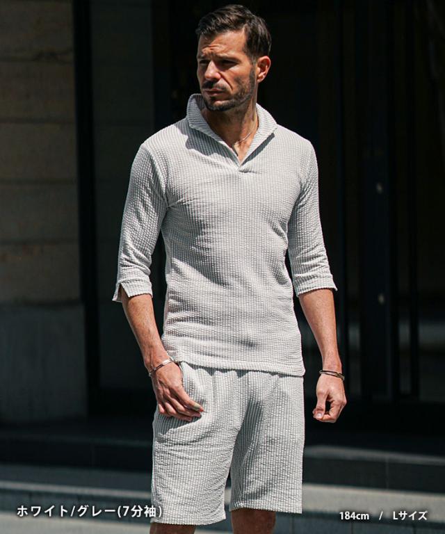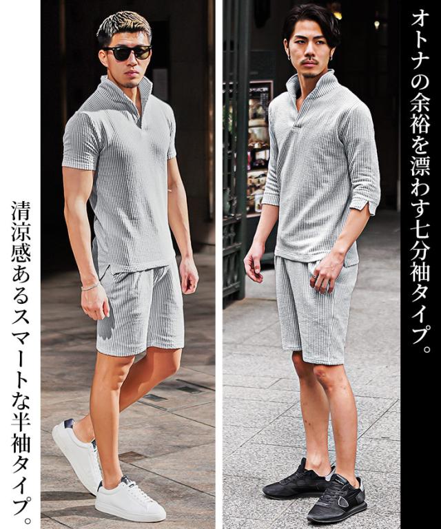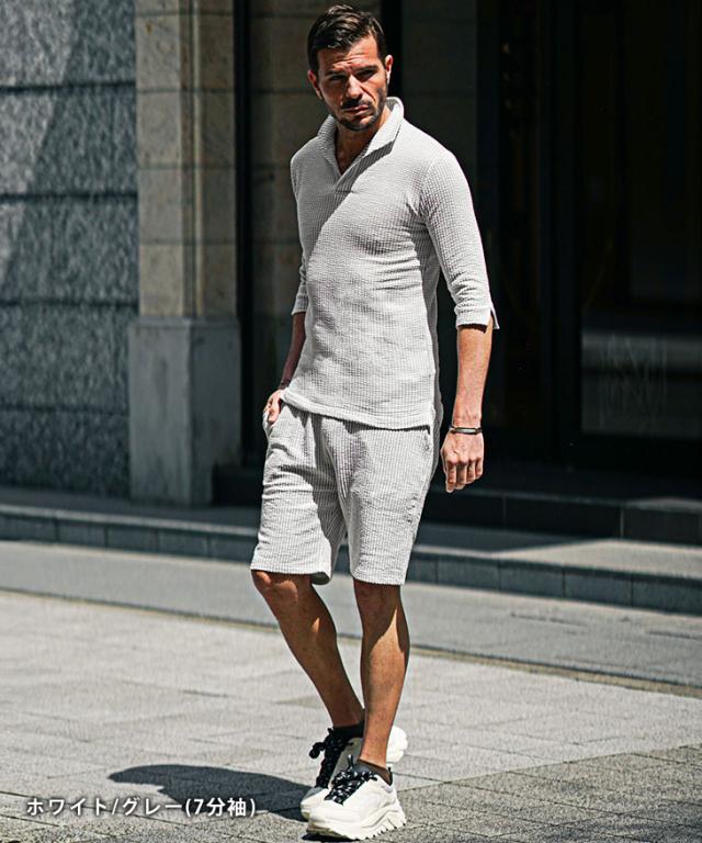 セットアップ メンズ ブランド ポロシャツ メンズ ハーフパンツ メンズ 短パン メンズ 半ズボン 7分袖 七分袖 ショートパンツ 半袖ポロシャツ イタリアンカラー ストライプ 2点セット 春 春服 春物 メンズファッション ちょいワル ちょい悪 お兄系 オラオラ系