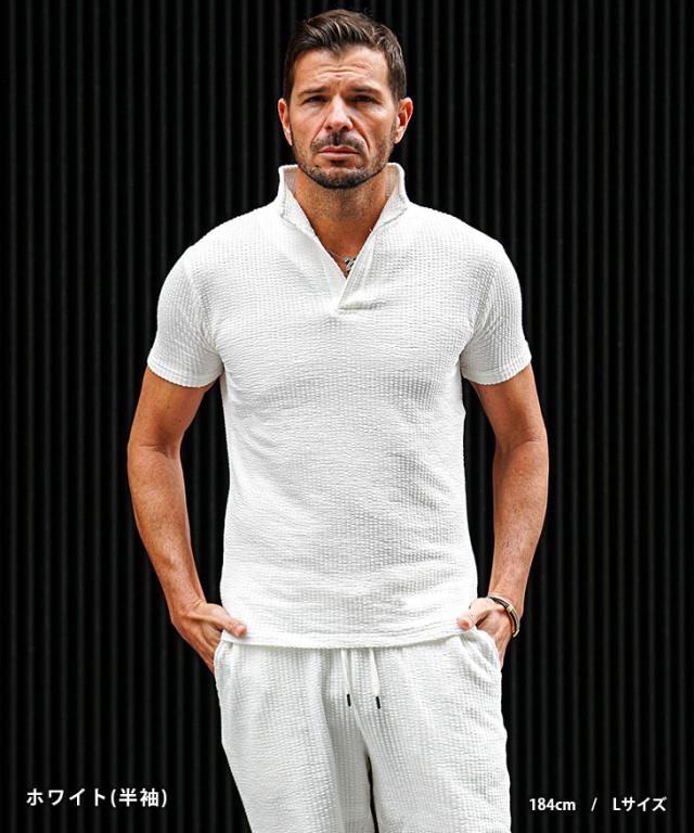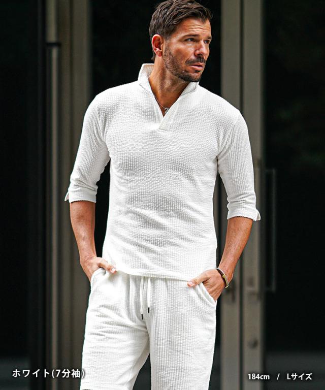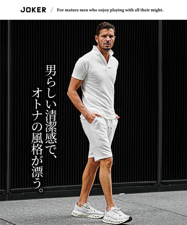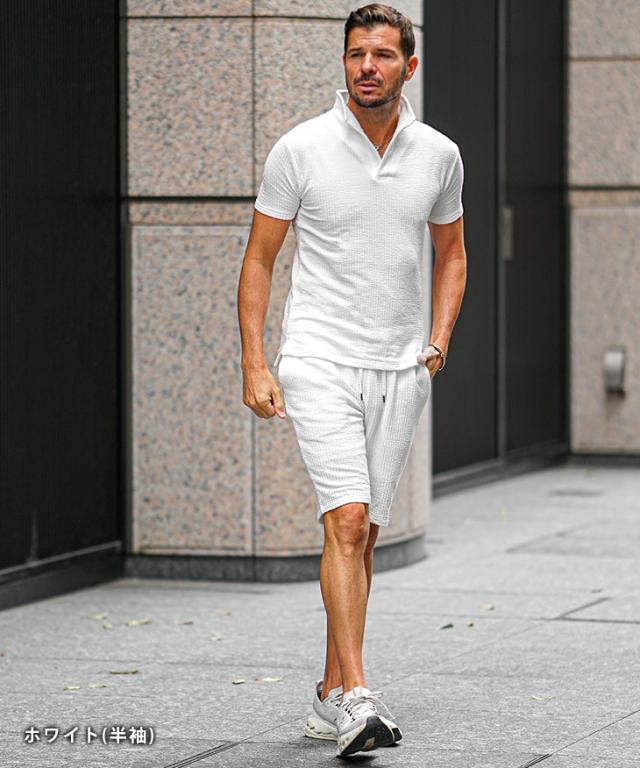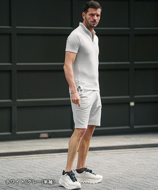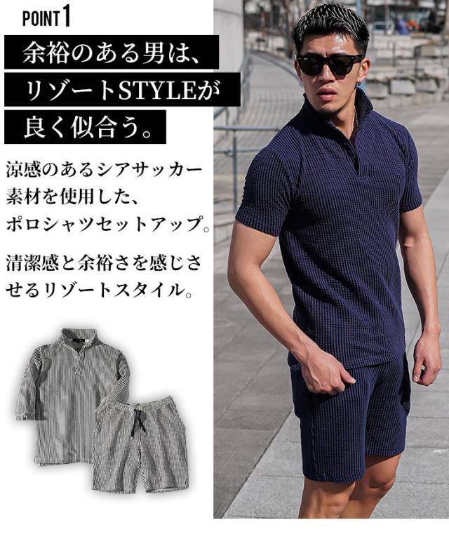 軽快なオトナの夏STYLE『シアサッカーサマーセットアップ』【シアサッカーサマーセットアップ】■Design/デザインシアサッカー素材で軽快に纏うポロシャツとハーフパンツのセットアップ。生地に凹凸をもたせたシアサッカー素材で清涼感を演出し、伸縮素材も配合することで肌なじみが良く、身体のラインに添った美シルエットに。軽やかで品のある佇まいがオトナの余裕を醸し出す。オトナリゾート気分を楽しめるセットアップで爽やかに魅せる日々を。■Material/素材感綿とポリエステルを使用し、柔らかく軽やかな着用感が特徴。シアサッカー素材のため肌にへばりつかず、汗ばむ時期も爽やかに着こなせるのが嬉しいポイント。
