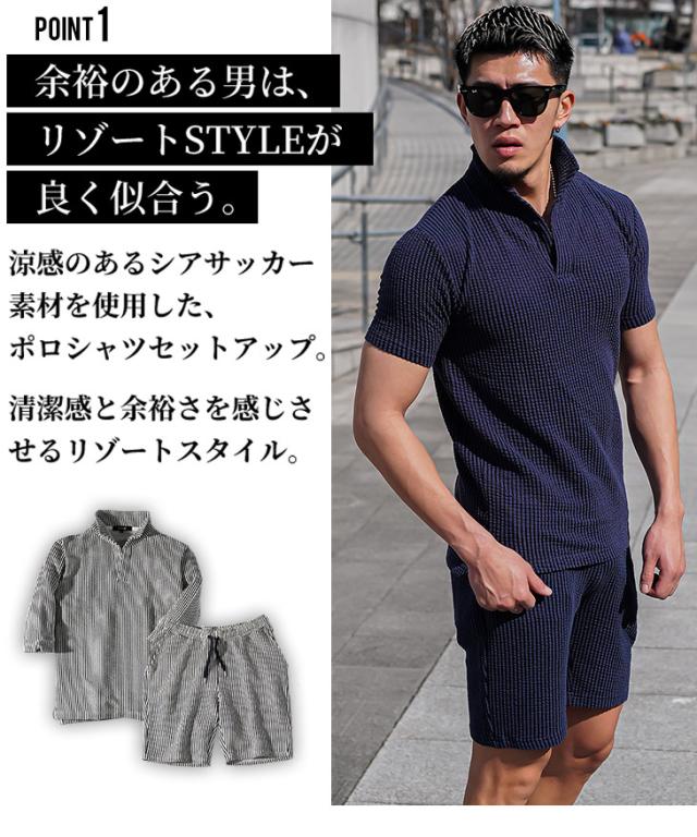 『シアサッカーサマーセットアップ』爽やかな肌触りが特徴のシアサッカー生地を使った半袖ポロシャツとハーフパンツのセットアップ。【大人の男は装いも中身も涼しげに】涼しげな装い、それは爽やかな雰囲気につながるモテへの重要事項。程よく開いた首元、そして体のラインにフィットするタイトシルエットが、爽やかかつ男らしさを表現してくれるポロシャツ。ハーフパンツは、丈感を膝から少し上に設定し、足元から爽やかな印象を演出。また、生地は表面に凹凸を作り、肌との接地面を少なくしたシアサッカー生地を採用することで、穿き心地は快適そのもの。見た目も中身も爽やかで涼しげな逸品、モテセットアップをあなたに。