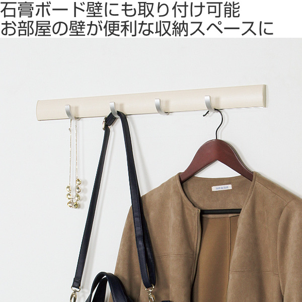 フックはスライド式左右に大きくスライドできるフックが4つ付いています。コートやバッグなど、掛ける物に合わせてフックの間隔を調整できます。