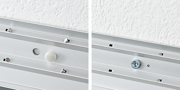 | 石膏ボード・ベニヤ板 石膏ボード用ピンを取付ベースに水平に取り付けます。さらにピンを上下に差し込みコインやカナヅチなどで固定します。 | 木壁用 木壁用ネジをドライバー使って固定します。 |