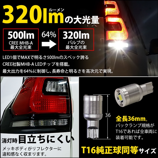 スズキ ハスラー (MR52S/MR92S) 対応 バックランプ LED T16 NEWボルトオンCREE MHB-A搭載 バックランプ用ウエッジバルブ ホワイト 6000K 無極性 2個入 5-C-3