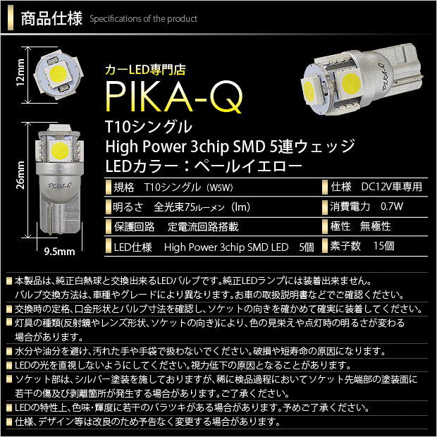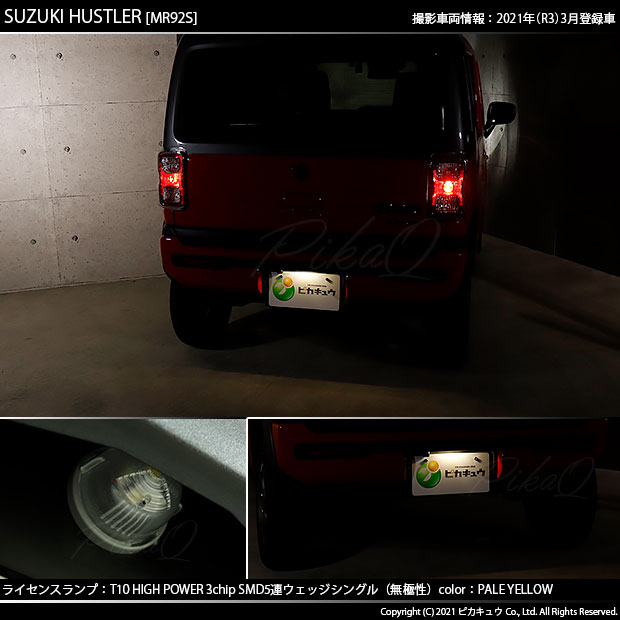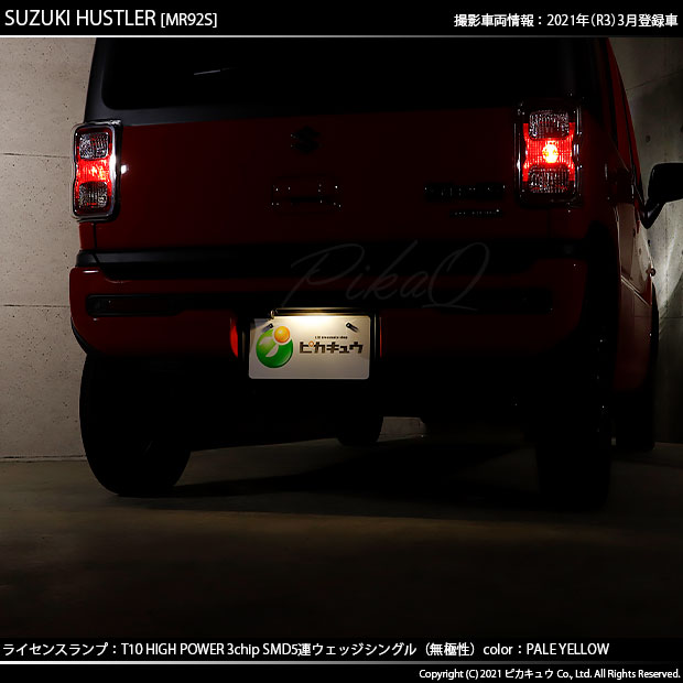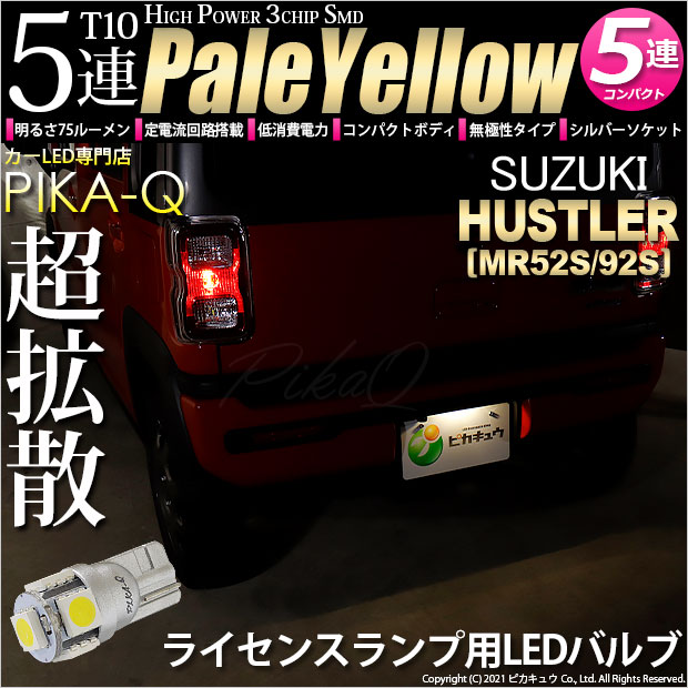 ピカキュウ,LED専門店,LEDバルブ,LED,SMD,T10,W5W,T10 HIGH POWER 3CHIP SMD 5連ウェッジシングル球,ペールイエロー,ライセンスランプ,番号灯,スズキ,ハスラー,SUZUKI,HUSTLER,MR52S,MR92S
