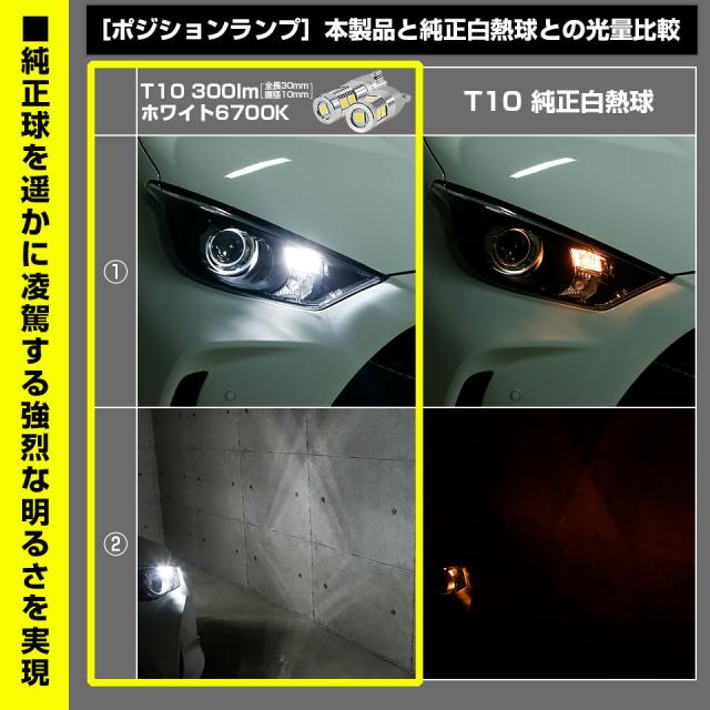バルブ1球の明るさは300ルーメン。T10規格純正白熱球と比較し約6倍の明るさを実現しています。