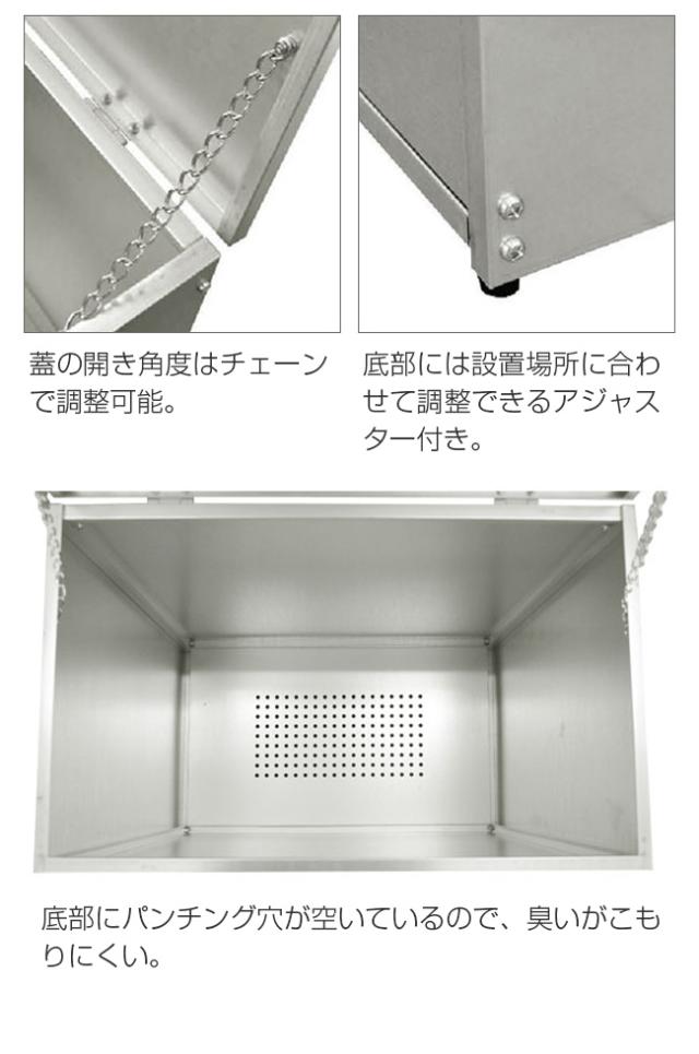サビにくいガルバリウム鋼板を本体に使用したシンプルな外観で、おしゃれなお庭やベランダなどに設置しても景観を損ないません。上開きのふたが付いたボックスタイプで、蓋は本体とチェーンで繋がっているので開け閉めもらくらく!もちろん、カラスに荒らされる心配もありません。