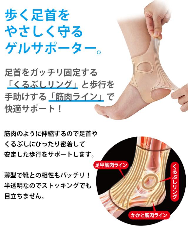 足首をガッチリ!元気ハツラツ歩行をサポート。足首をやさしく守るゲルサポーター。足首をガッチリ固定する「くるぶしリング」と歩行を手助けする「筋肉ライン」で快適サポート!筋肉のように伸縮するので足首やくるぶしにぴったり密着して安定した歩行をサポートします。薄型で靴との相性もバッチリ!肌色なのでストッキングでも目立ちません。
