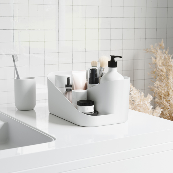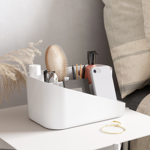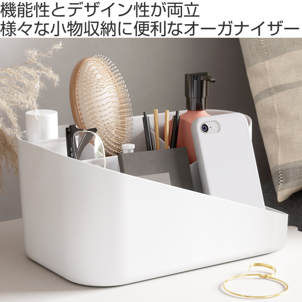 散らかりがちな化粧品や化粧道具など細々した小物類をスッキリまとめて保管・整理できるオーガナイザーです。様々なサイズの物が収納できるスペースがあるので、コスメ用品を収納するのはもちろん、オフィスのデスク上でよく使う小物の整理にも役立ちます。