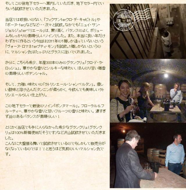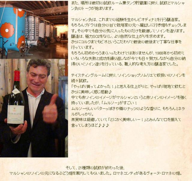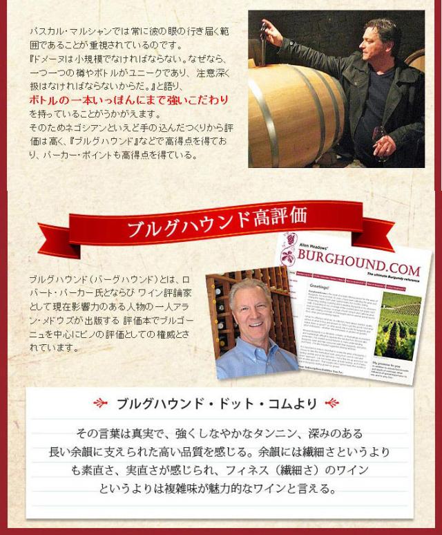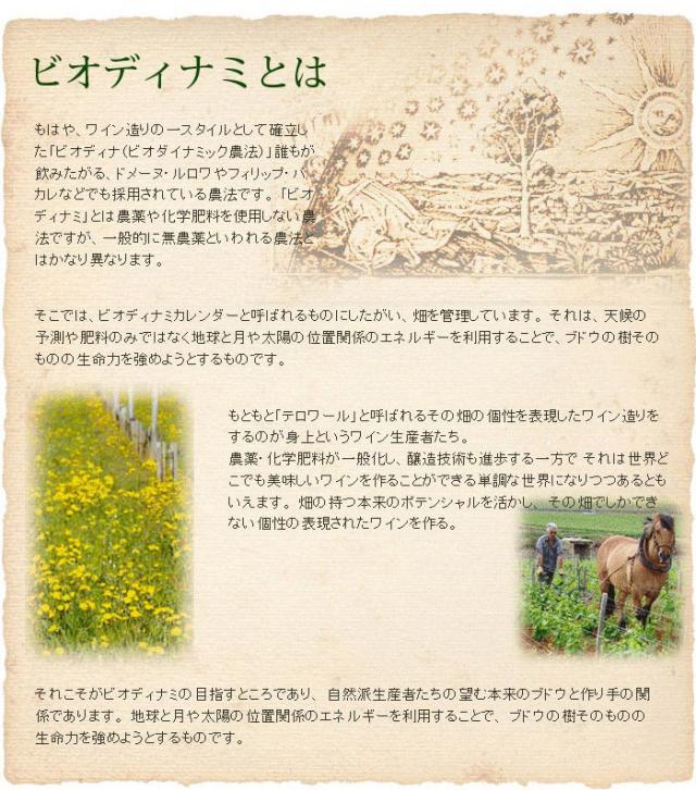 | 醸造方法 | ブドウは除梗せず、数日間冷やした状態でタンクに漬け込みます。 アルコール発酵の間は一日2回ピジャージュを行い、果皮や梗のエッセンスを抽出します。 アルコール発酵が終わった後も、そのまま果皮や茎を漬け込んだ状態で、ポンプ・オーバーを行いながらワインに深みを与えます。 空気圧の圧搾機で負荷をかけないよう自然な圧力でプレスします。 1/4は新樽を使い、残りは古樽を使い16か月間熟成させます。 樽はすべてジュピーユの森から伐りだされたフレンチオーク材の樽を用います。 澱引きは一度だけ、マロラクティック発酵の後に行います。それ以外はフィルターも通さず、清澄も行いません。熟成後、瓶詰します。 全工程で酸化防止剤を添加せずワイン造りを行います。 また、ビオディナミカレンダーに基づいたルールで醸造を行います。 |