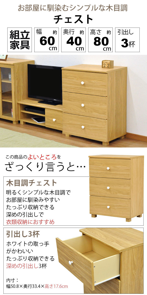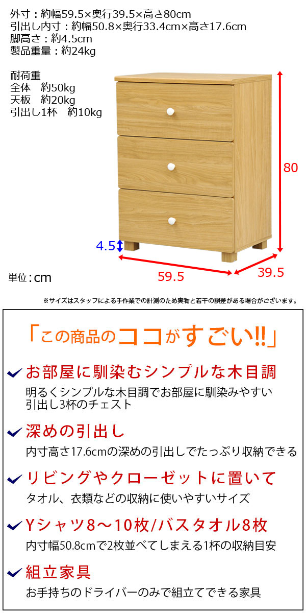 商品名:チェスト引き出し3段 おしゃれ 60幅 幅59.5cm 奥行39.5cm 高さ80cm(約幅60cm 奥行40cm 高さ80cm) 衣類収納 ナチュラル シンプル ベーシック リビング収納 引出し 引出 リビングボード サイドボード カップボード ルームボード ベージュ 茶色 一人暮らし ファミリー 幅59.5cm 奥行き39.5cm 高さ80cm(約幅60cm 奥行き40cm 高さ80cm) GTNS-03