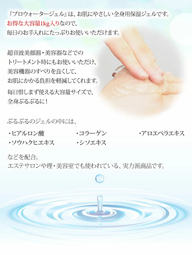 【おまけ付き】プロウォーター・ジェル 1kg (送料無料) 業務用 大容量 エステ サロン 美容室 美顔器 美容機器 フェイシャル マッサージ ジェル ボディ 超音波 低周波 高周波 ソニック EMS