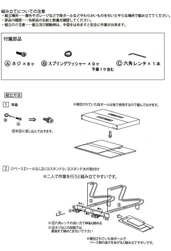商品詳細:自転車をスッキリ収納できる丈夫なスタンドです。 製造国:日本 素材・材質:ベース・スタンド:スチール/アクリル塗装(プライマー処理) 商品サイズ:W710×D590×H775mm 仕様:組立式【収容可能タイヤサイズ】上段:20~28インチ下段:16~28インチタイヤ幅5cm以下※自転車の前カゴの形状によっては収納できない場合あり。 付属品:ネジ×8、スプリングワッシャー×9、六角レンチ×1、組立説明書