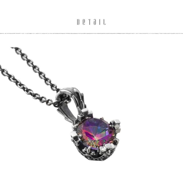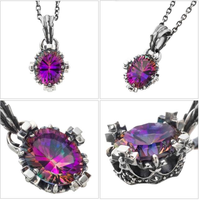 | 仕様 | 石はマルチカラーに輝く一粒水晶ペンダント。 ミスティックとは、虹色に発色をするチタンコーティングした石の仕様。 石座は楕円の王冠デザインで彫りこみも繊細。裏面も石が採光出来る仕様。 |