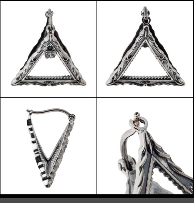 | 仕様 | 三角錐に繊細なアンティーク装飾を施したピアス。 スケルトンな三角立方体デザインは、お洒落な個性的なフォルムです。 装着も遮断式ですので着けやすく、キャッチを無くす心配もありません。 ワンポイントの石はCZ。 |