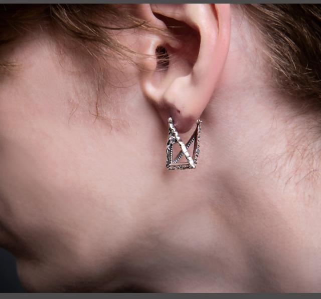 三角錐に繊細なアンティーク装飾を施したピアス。