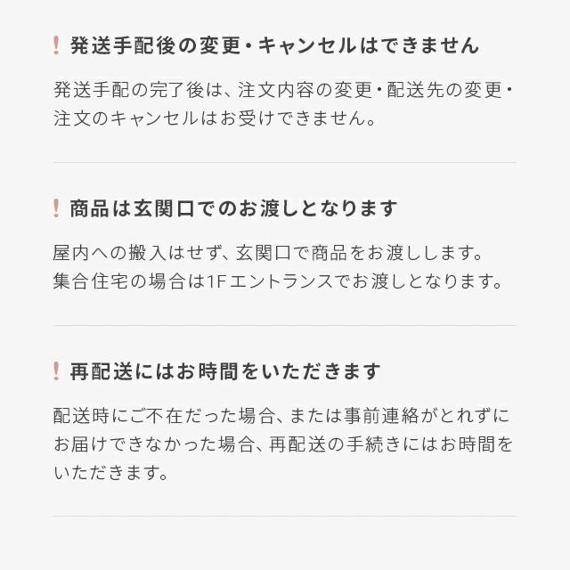 商品の配送は全て宅配便での玄関渡し(集合住宅の場合は1階エントランス渡し)となります