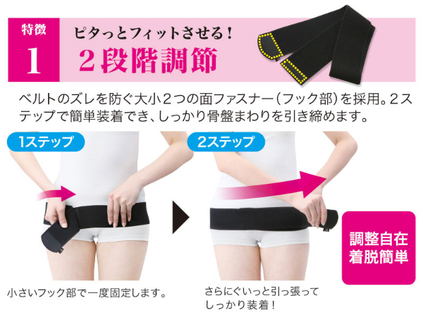 ベストポジションが自由に選べる!伸縮力のある薄型骨盤ベルト。伸縮率が高い薄型骨盤ベルト。とってもよく伸びて、しっかりと骨盤まわりにフィットします。好みの場所に、面ファスナーで付けれるので、引き締め具合も自分好みに。緩めて付ければ、就寝時にも着用できます。薄型なので、アウターに響きにくい。【適応サイズ】骨盤まわり 約130cmまで【カラー】ブラック、ベージュ【材質】ポリエステル・ナイロン・ポリウレタン【製造国】日本【販売者】株式会社ニーズ