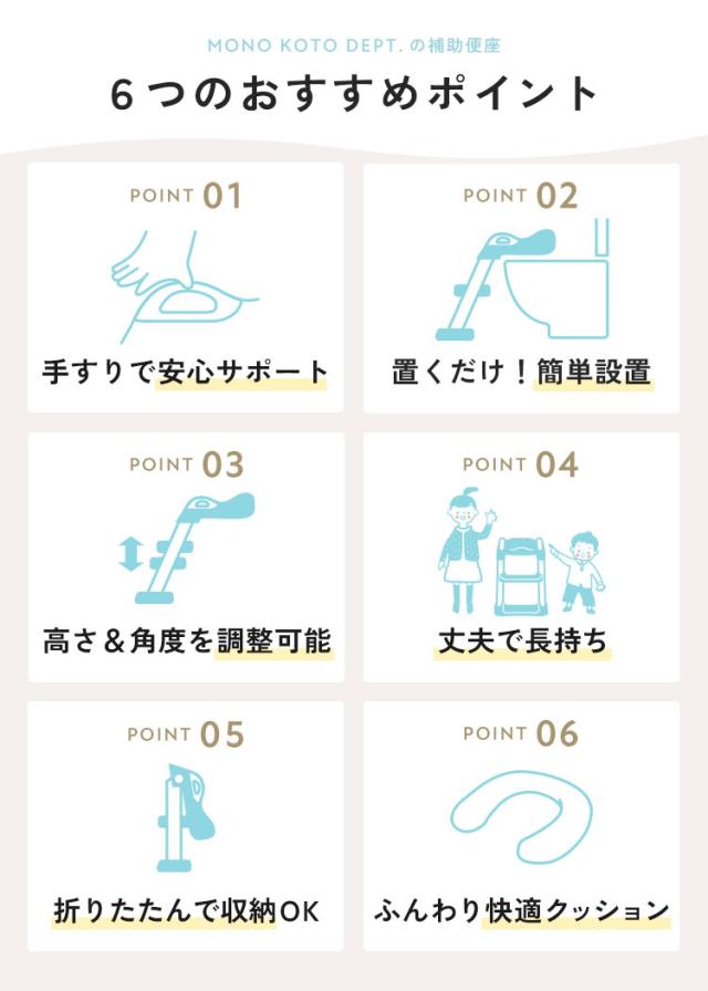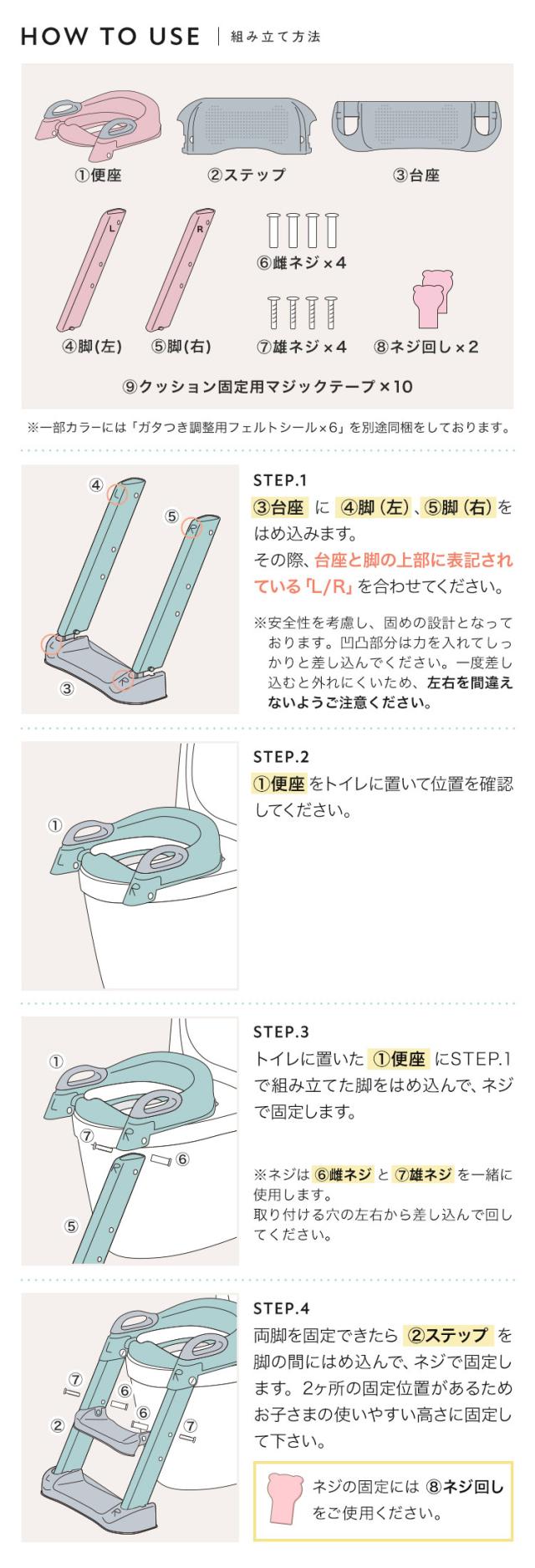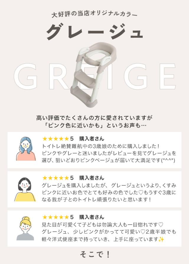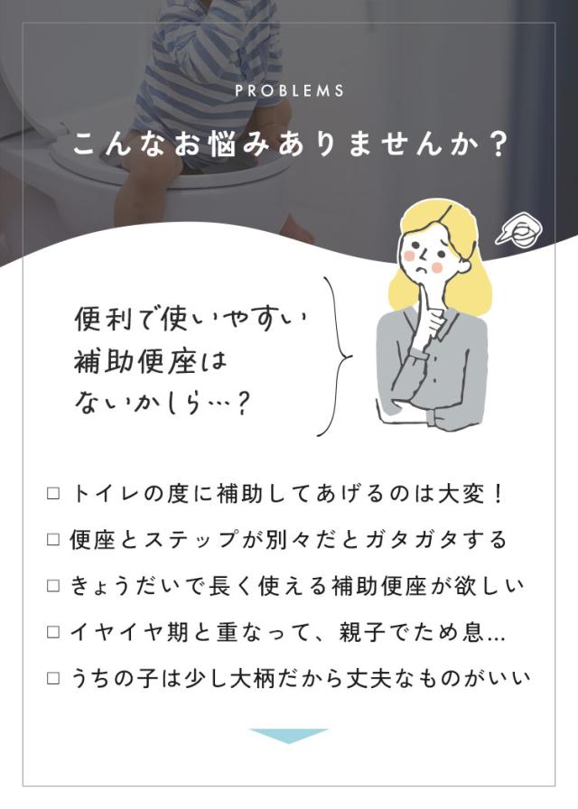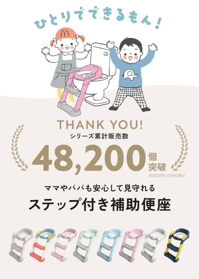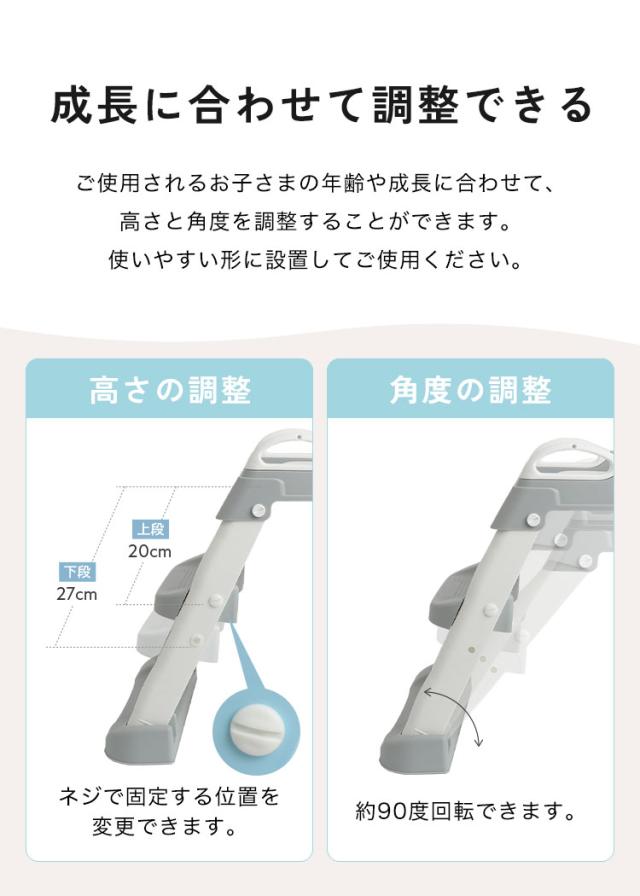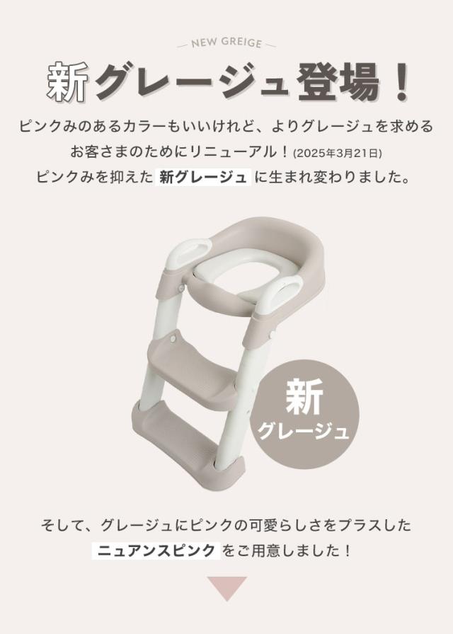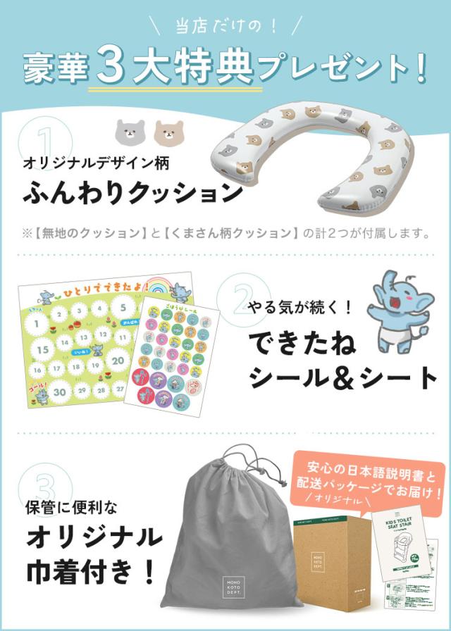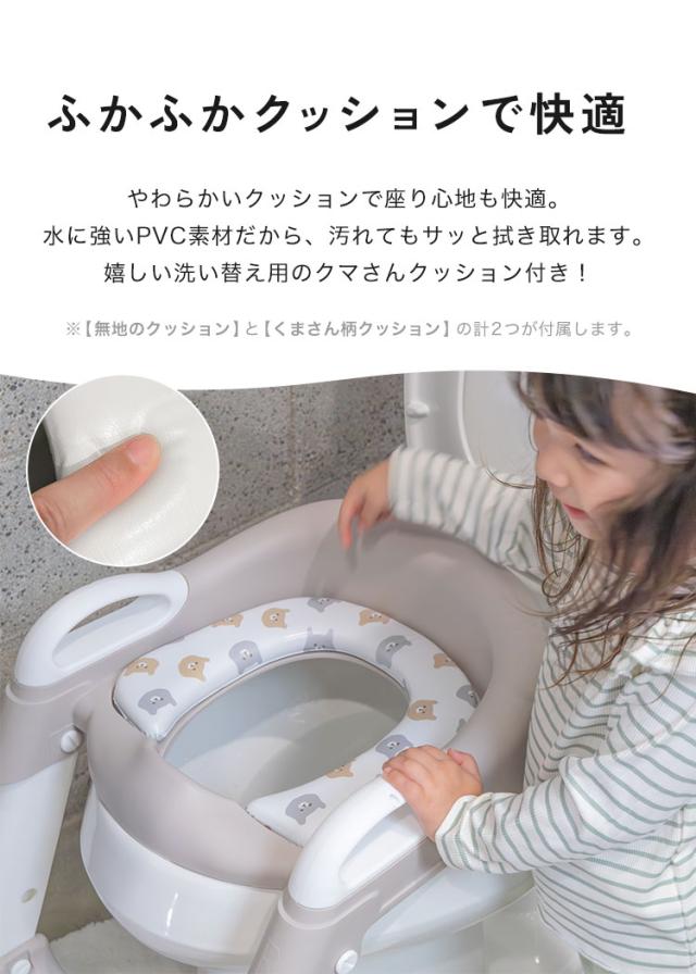 | 【商品説明】 ひとりで登れる、ステップ付き子供用補助便座。 お子様がひとりで使用できるように、アームレスに設計されたデザイン。 持ち手部分を埋め込むことにより、しっかりと掴んで安定できます。 内側前面部分には段差をつけて、おしっこの飛び散りをガード。 男の子も安心してご使用いただけます。 ステップはご自宅のトイレスペースに合わせて角度を調整でき、足場は高さ調整可能。 便座への設置面はもちろん、床への設置面にも滑りとめが施され、 滑る心配がなく安定してご使用いただけます。 さらに、耐衝撃に優れたPP素材でリサイクル性が高く、燃やしても有害ガスが発生しない環境にいい素材を使用。クッション部分には、耐水性に優れたPVC素材を使用し、おしっこの飛び散りも弾いてくれて、水洗いも可能。 折り畳みが可能なので、スペースを取らずに収納できるのも魅力。 ※予備クッションはかわいいくまさん柄に順次切り替えを行っています。 【サイズ】 本体:幅35 × 高さ38〜43 × 奥行き38cm ステップ足場:幅40 × 奥行き12cm 折り畳みサイズ:幅40 × 奥行25cm 【重量】 1.5kg 【素 材】 本体:ポリプロピレン クッション:PVC 【カラー】 新グレージュ / ニュアンスポップ / ニュアンスピンク / グリーン / ブルー / ピンク / グレー / イエロー 【スペック】 子供が持ちやすいアームレス設計 飛び散りガード 本体は環境に優しいPP素材、クッションは耐水性に優れたPVC素材 ステップ付き&角度と高さの調整が可能 2重の滑り止めで安心 |