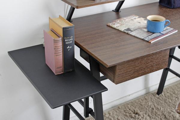 高さ調節できる両サイドの可動棚でスペースをより効率的に活用できます。天板を広く使いたいときや収納棚が欲しいときなど、用途に合わせて付け替えができて便利です。