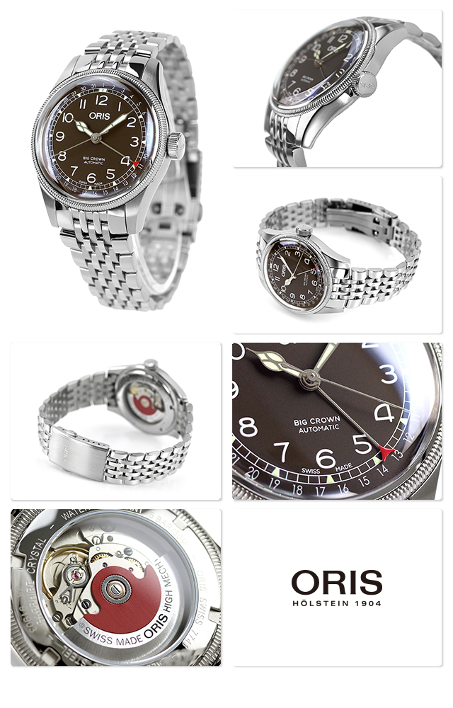 正規品 7年保証キャンペーン オリス ビッグクラウン ポインターデイト 40mm スイス製 自動巻き メンズ 腕時計 754-7741-4064M ORIS BIG CROWN POINTER DATE アナログ ブラック×ブラウン ◆ORIS(オリス)は、ポール・カッティン氏とジョージ・クリスチャン氏の2人によってスイスのヘルシュタインで創設されました。近くを流れる小川にちなんで社名をオリスと命名。手頃な価格ながら、革新的で高機能かつ実用的な機能を備えた本格機械式時計で知られ、世界中の時計ファンから愛されているブランドです。 オリスと航空を結びつけたビッククラウンは、1938年誕生以来パイロットウォッチの原型になったコレクション。時代を超越したオリジナルモデルへの忠実なオマージュです。パイロットがグローブを着けたまま操作できる大型リューズ(クラウン)とセンター針で日付を示す特殊なコンプリケーションを備えた、先駆的な時計です。カジュアルスタイルにはもちろん、クラシックな大人の装いにも味わいを添えてくれます。 機械式腕時計