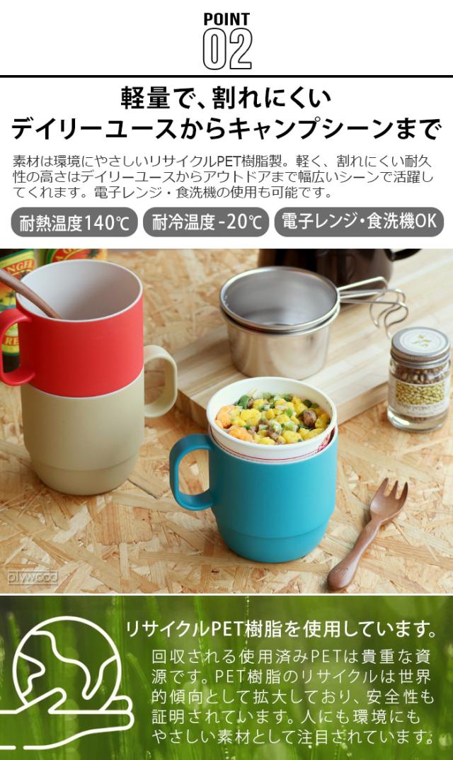 軽量で割れにくいリサイクルPET樹脂を使用しており、デイリーユースからアウトドアまで幅広く活躍してくれます。スタッキング可能なため、使わないときはコンパクトに収納できるのも嬉しいポイント。