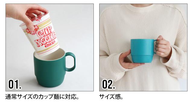 通常サイズのカップラーメンから、はるさめヌードルまで幅広く対応しているので、使い勝手は抜群♪もちろん普通のマグカップとしてもご使用いただけます。