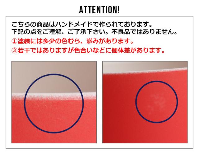 | 特殊な塗装を施しているため、擦り傷のようなものができる場合がございますが不良品ではございません。製品の風合いとしてお使いください。 電子レンジご使用の際は下記の時間をお守りください。 ・定格高周波出力600〜500W:過熱2分以内 ・追加加熱600〜500W:過熱1分以内 油脂分や糖質の多い食品の加熱は高温になりやすいのでご注意ください。 オーブン・グリル機能では使用できません。 家庭用食洗器、乾燥機ご使用の際は重いものをのせたり、ヒーターや熱風吹き出し口のそばに置かないでください。傷付いたり変形する恐れがあります。 業務用の食洗器、乾燥機は使用しないでください。 酸性の食品により変色する場合があります。 カレーやケチャップ、コーヒーなど油分や色味の強い食品、飲料は色移りすることがあります。 食品衛生法に適合した塗料を使用していますが使い始めにニオイが気になる場合は製品を70〜80℃のお湯に浸し、お湯が冷めるまで放置し、取り出すことを何回か繰り返してください。 |