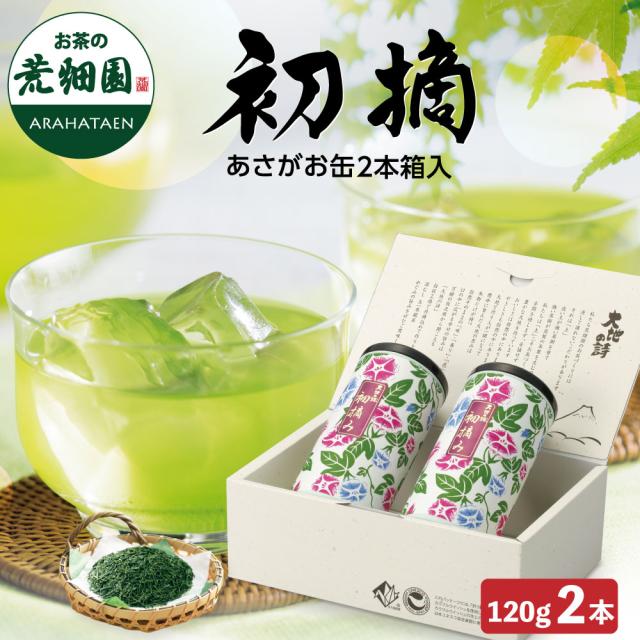 お中元 ギフト 高級茶 化粧箱 あさがお缶 2本箱入 送料無料 産地直送 初摘 120g紙缶×2本 プレゼント 贈答品 お茶 日本茶 荒畑園 静岡県 牧之原産 静岡茶産 緑茶 御中元 熨斗 茶葉 静岡茶 茶 お土産 おしゃれ お茶缶 茶筒 朝顔 agesugi_sgu