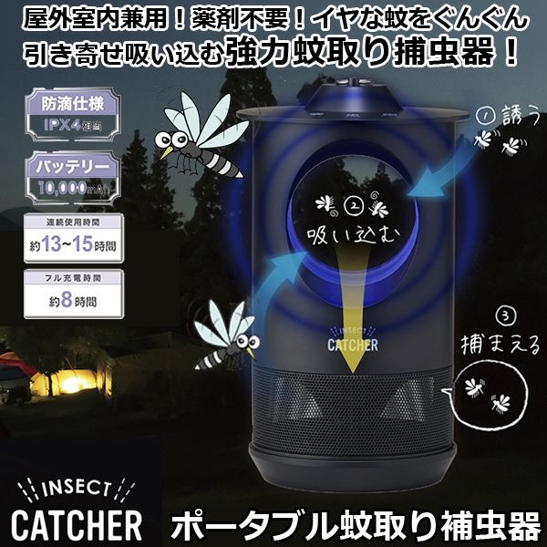 ポータブルLED蚊取り補虫器 (充電式 吸引式蚊取り器 蚊取り器 殺虫器 殺虫灯 屋内 屋外 薬剤不要 防滴仕様 夏の虫刺され対策)