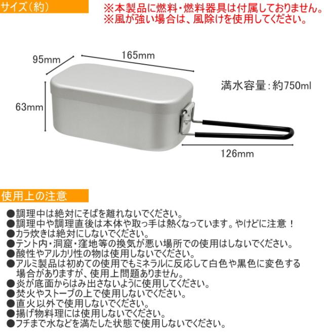 | 使用上の注意 | 調理中は絶対にそばを離れないでください。 調理中や調理直後は本体や取っ手は熱くなっています。やけどの危険がありますのでお子様は遠ざけ、絶対に手を触れさせないでください。 カラ炊きは絶対にしないでください。 テント内・洞窟・窪地等の換気が悪い場所での使用はしないでください。 使用するときは軍手や革手袋等を着用してください。 酸性やアルカリ性の物は使用しないでください。 アルミ製品は初めての使用でもミネラルに反応して白色や黒色に変色する場合がありますが、使用上問題ありません。 直火以外で使用しないでください。 |