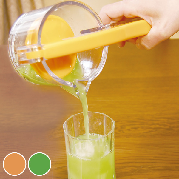 お好みのフルーツを入れてハンドル部分をギュッと閉めてグラスに注いで出来上がりです。ハンドル部分がテコの応用になっており、少ない力で搾れるので、お年寄りやお子様でも簡単に使用できます。