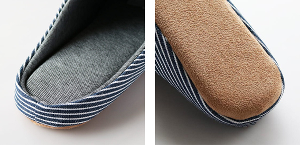 | 履き心地 中敷きはフカフカしていて履き心地抜群です。また、中敷きは取り外しが出来ないようになっており、歩いている途中でズレたり取れたりする心配がいりません。 | 静穏設計 音がしにくいポリスウェード生地を採用しているので、スリッパ特有のパタパタ音が鳴りにくいです。 |