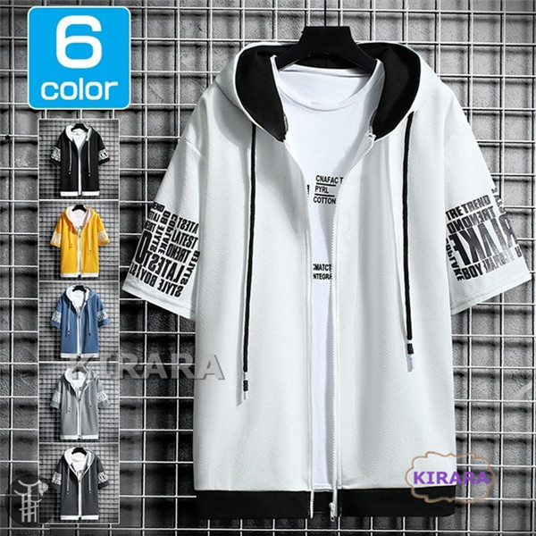 パーカー 半袖 メンズ フード付き ジップアップ 英文字 カジュアルアウター