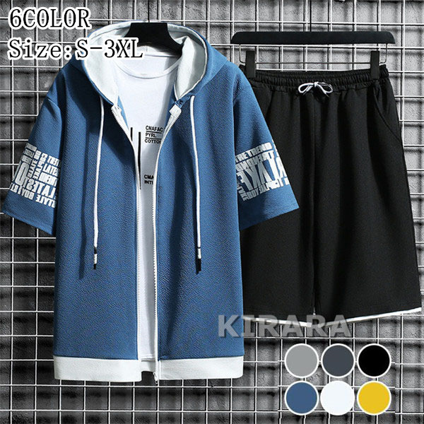 セットアップ メンズ 半袖 上下セット フード付き ジップアップ 英文字