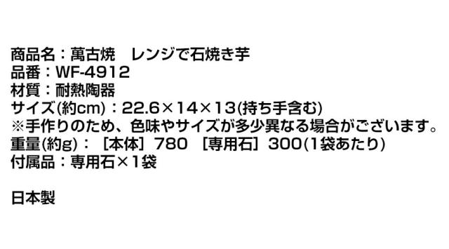 萬古焼 レンジで石焼き芋 WF-4912 万古焼 焼き芋 自家製 電子レンジ 焼き物 蒸し料理 やきいも鍋 焼きいも鍋 焼き芋器 レンジで焼き芋 遠赤外線 ![]() ![]() ![]() ![]() ![]() | ||||