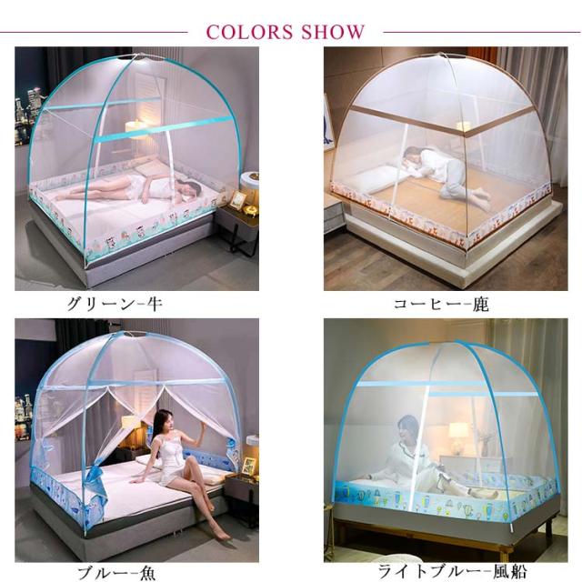 | 【商品名】春夏用のワンタッチ式蚊帳 【素材】ポリエステル 【サイズ】1.2mベッド適用 1.5mベッド適用 1.8mベッド適用 【ドア】2ドアタイプ 【底面】底面あり 【特徴】 ・【大空間、圧迫感ない】優れたポリエステル材質を採用しており、大空間デザイン、圧迫感がありません。メッシュ式なので、通気性良くて、蒸し暑感が全然感じません、快適な睡眠環境を実現できます。 ・【ワンタッチ式蚊帳、広げ方は簡単】テントのようにパッと広がるワンタッチ式なので、設置もらくらく簡単です。3つステップだけで蚊帳を広げることができて、面倒な組み立てがなくてとても便利です。 ・【高密度、薬を使わない蚊の退治】網目が細かいので、嫌な蚊、虫などを全方位的にガードできます。耳元で聞こえる羽音に気を立てることなく、朝までぐっすり安心して眠れます.薬剤も使わなくて肌や体に影響なくて、子供と赤ちゃんに最適、ご家庭でも安心です。爽やかな色がお部屋の雰囲気に合わせやすいです。 ・【底生地付き】テントのように底面まで張れていて、外からも下からも虫や蚊から守れて、子供の転落を防ぎます。柔らかい生地で作られており、手触りが優しいです。 ・【2ドア】2ドアタイプなので、出入りやすいです。 ・【収納簡単、持ち運び便利】折り畳み式で、収納バッグ付き、収納もとても便利です。収容時コンパクトなのでスペースを取らなくて、旅行やキャップ等の防虫対策に大活躍です。 パッケージ内容:蚊帳本体×1 収納袋×1 簡単に組み立て可能: (1)自然的に展開する (2)四つの脚部を固定する (3)細かいところを整理する ご注意: ※.組み立て説明書なし、組み立て時、上記のステップをご参考して、組み立てください、ご不明なところがあれば、お気軽にこちらにお問い合わせください。 ※生地の取り方により、柄の位置等写真と異なる場合がございます。ご了承ください。 ※ご利用のモニター、パソコンの環境によっては実際の商品カラーと若干の違いがある場合もございます。予めご了承ください。 | |