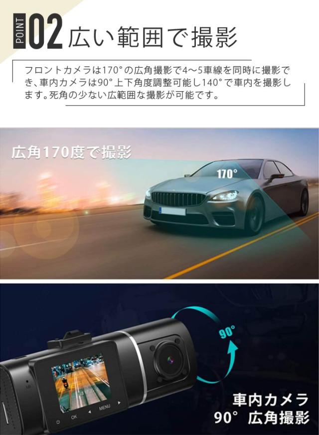 _ 前後カメラ デュアル1080pフルHD:フロントカメラ1920×1080P/30FPS、車内カメラ1920×1080P/30FPSで同時に録画します。車内カメラと録音用マイクでドライブ時の車内状況を鮮明に記録できます。 _ 小型&170°の広角撮影:1.5インチディスプレイ搭載。超コンパクト設計で、フロントガラスに取り付けても視界の邪魔にならず運転に集中し、快適なドライブを楽しめます。フロントカメラは170°の広角撮影で4〜5車線を同時に撮影でき、車内カメラは90°上下角度調整可能し140°で車内を撮影します。死角の少ない広範囲な撮影が可能です。