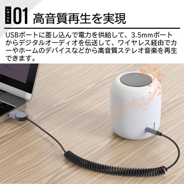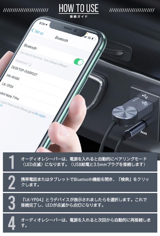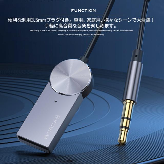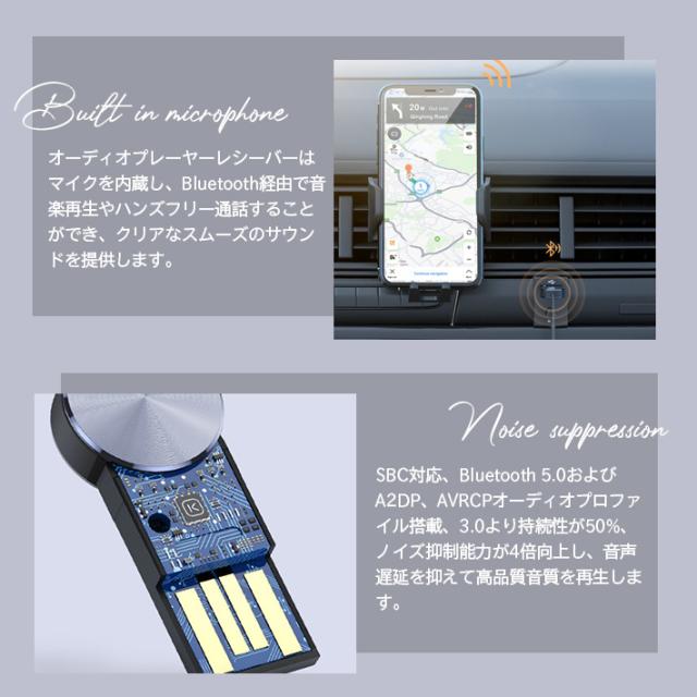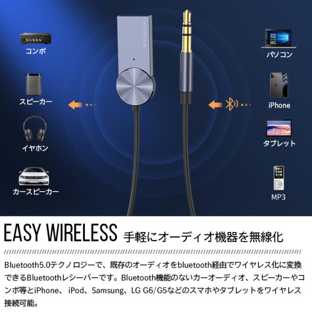 手軽にオーディオ機器を無線化:Bluetooth5.0テクノロジーで、既存のオーディオをbluetooth経由でワイヤレス化に変換できるブルートゥースレシーバーです。Bluetooth機能のないカーオーディオ、スピーカーやコンポ等とiPhone、 iPod、Samsung Galaxy S8 plus、LG G6/G5、HUAWEI Mate9などのスマホやタブレットをワイヤレス接続可能、汎用3.5mmプラグ付き、車用、家庭用、様々なシーンで大活躍!高音質再生を実現:使いやすさ:オーディオプレーヤーレシーバーはマイクを内蔵し、Blue-tooth経由で音楽再生やハンズフリー通話することができ、クリアなスムーズのサウンドを提供します。USBポートに差し込んで電力を供給して、3.5mmポートからデジタルオーディオを伝送して、ワイヤレス経由でカーやホームのデバイスなどから高音質ステレオ音楽を再生できます。