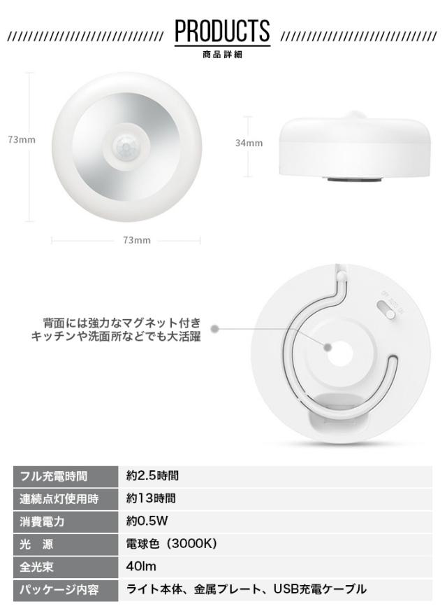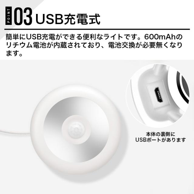 【USB充電式】簡単にUSB充電ができる便利なライトです。600mAhのリチウム電池が内蔵されており、電池交換が必要無くなります。環境保護省エネなので、満タンで最大約三ヶ月間使用可能(センサーモード1日約20回)です。常時点灯モードでも約13時間使用可能です。