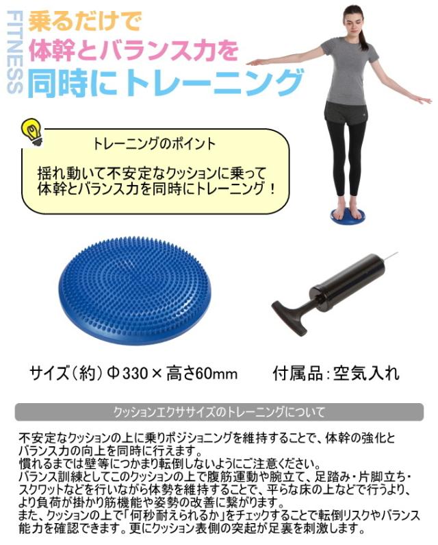 | 特徴 | 揺れ動いて不安定なクッションに乗ってトレーニングすることにより、体幹とバランス力を同時に改善。 バランス訓練としてこのクッションの上で腹筋運動や腕立て、足踏み・片脚立ち・スクワットなどを行いながら体勢を維持することで、平らな床の上などで行うより負荷が掛かり、筋機能や姿勢の改善に繋がります。 また、クッションの上で「何秒耐えられるか」をチェックすることで転倒リスクやバランス能力を確認できます。 そのほかのダイエット・フィットネス関係はこちら↓ ダイエット・フィットネス関係 |