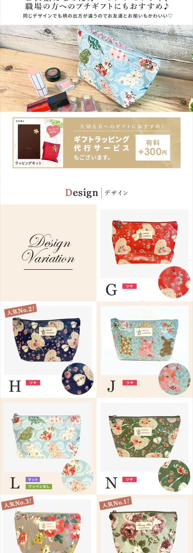 - 友達から似た様なポーチをもらい ちょっとしたプレゼントにと探しあてたポーチ 1番人気が無く残念 たくさんの柄があり迷いましたが 年齢を考えてシックな柄に