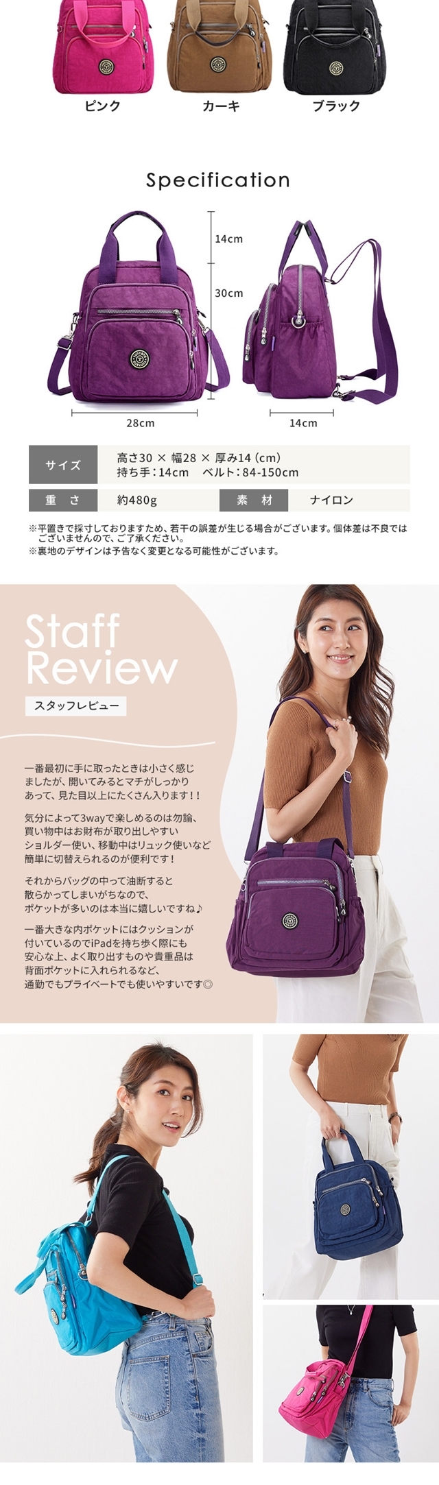 - 大きめのバックが欲しく、3wayに惹かれて購入しました。 色はカーキにしました。 ちょっと写真より色味が濃いめかなと思いましたが可愛いのでこれから使いたいと思います。